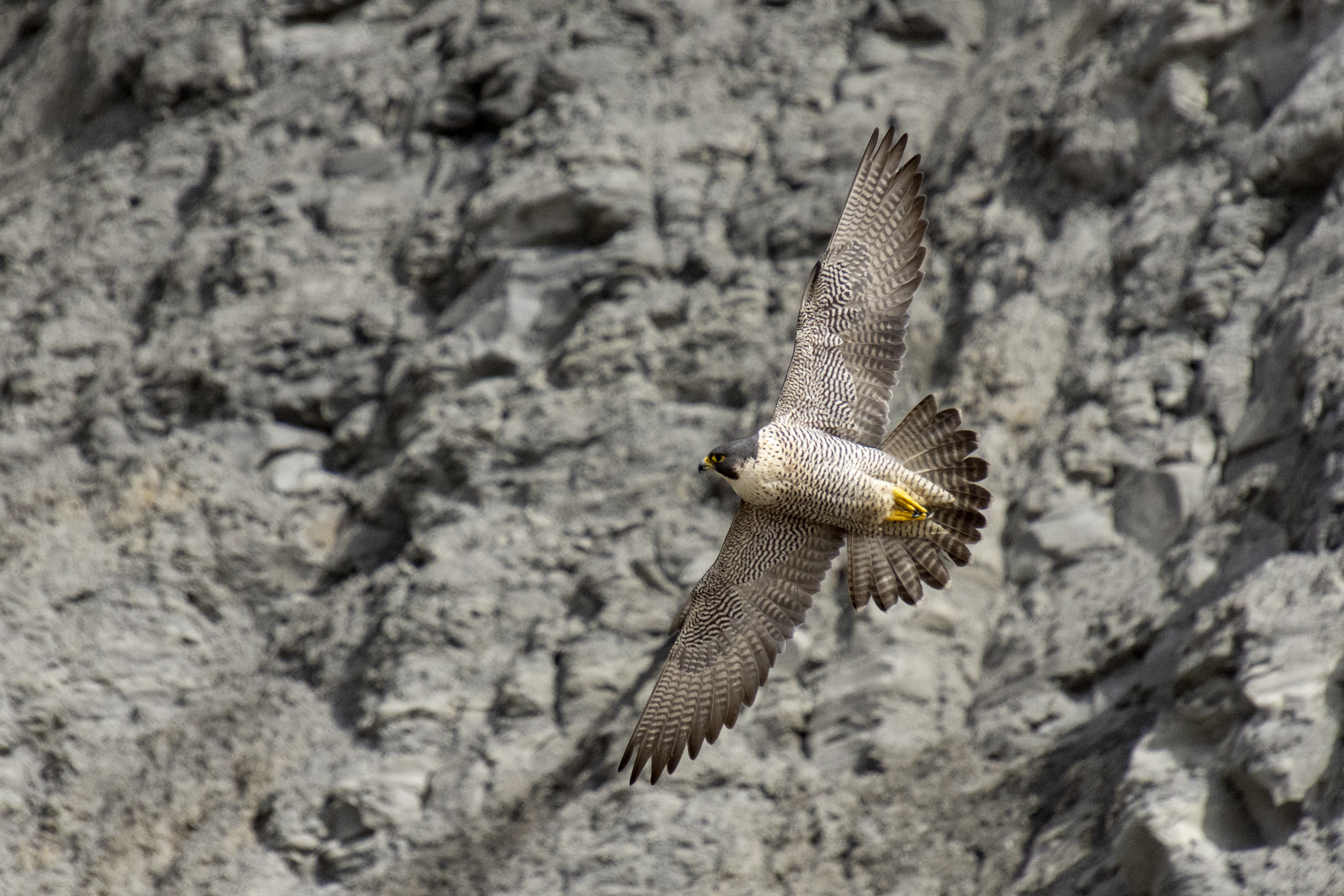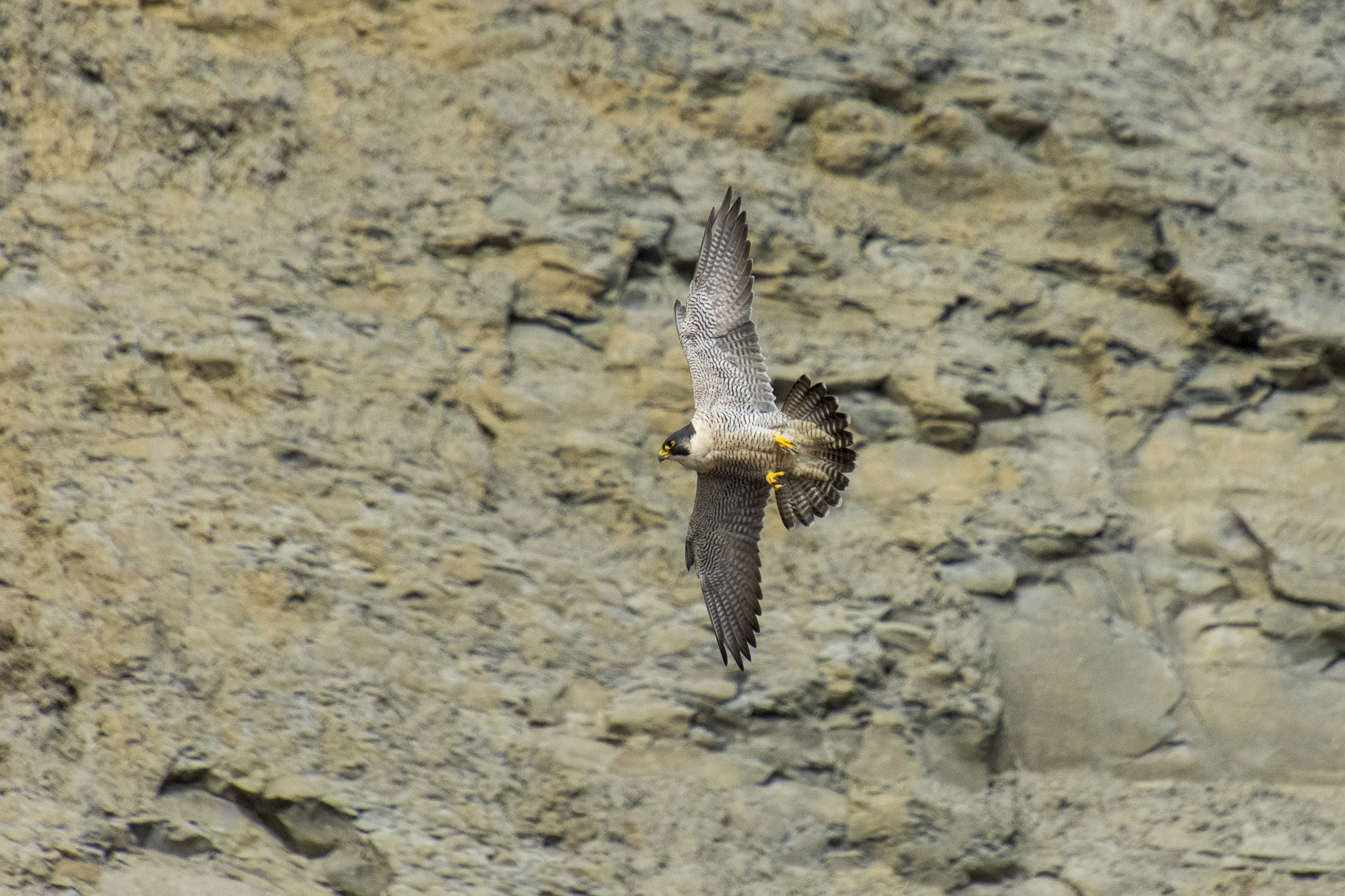 There was nothing around, of course, but it didn’t matter, the walk was lovely anyway. After a few minutes my wife noticed a Buzzard flying up along the cliff tops, so I looked up and pointed the camera – the cliffs were beautifully lit by the afternoon sun, making them even more picturesque than usual, and even a Buzzard against them would make a nice picture. Funny that we’re so blasé about Buzzards these days – it wasn’t so long ago they were in serious decline, and a rare sighting would be something to get very excited about. But now they’re doing well, we see them all the time, and think nothing of them. They are still magnificent birds though – but I digress, because when I looked, I realised very quickly that the bird my wife had seen wasn’t a Buzzard.