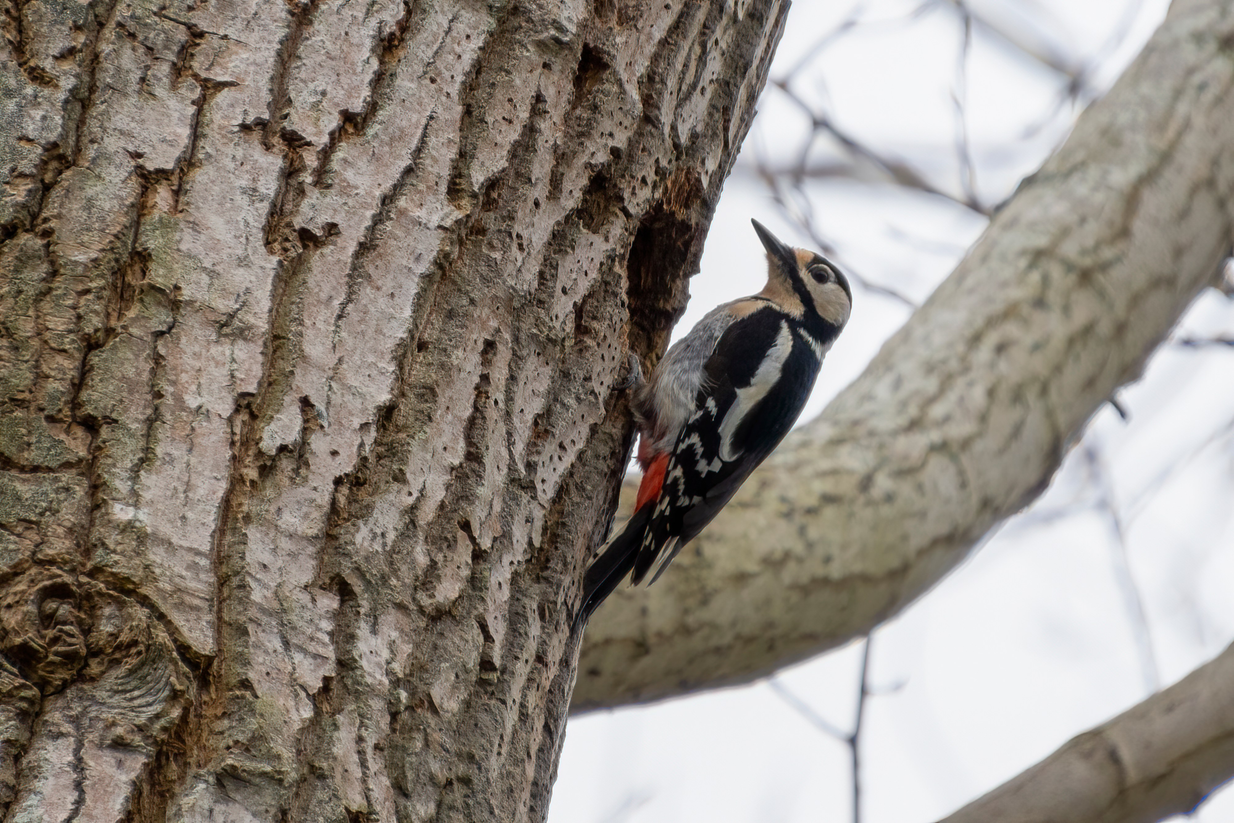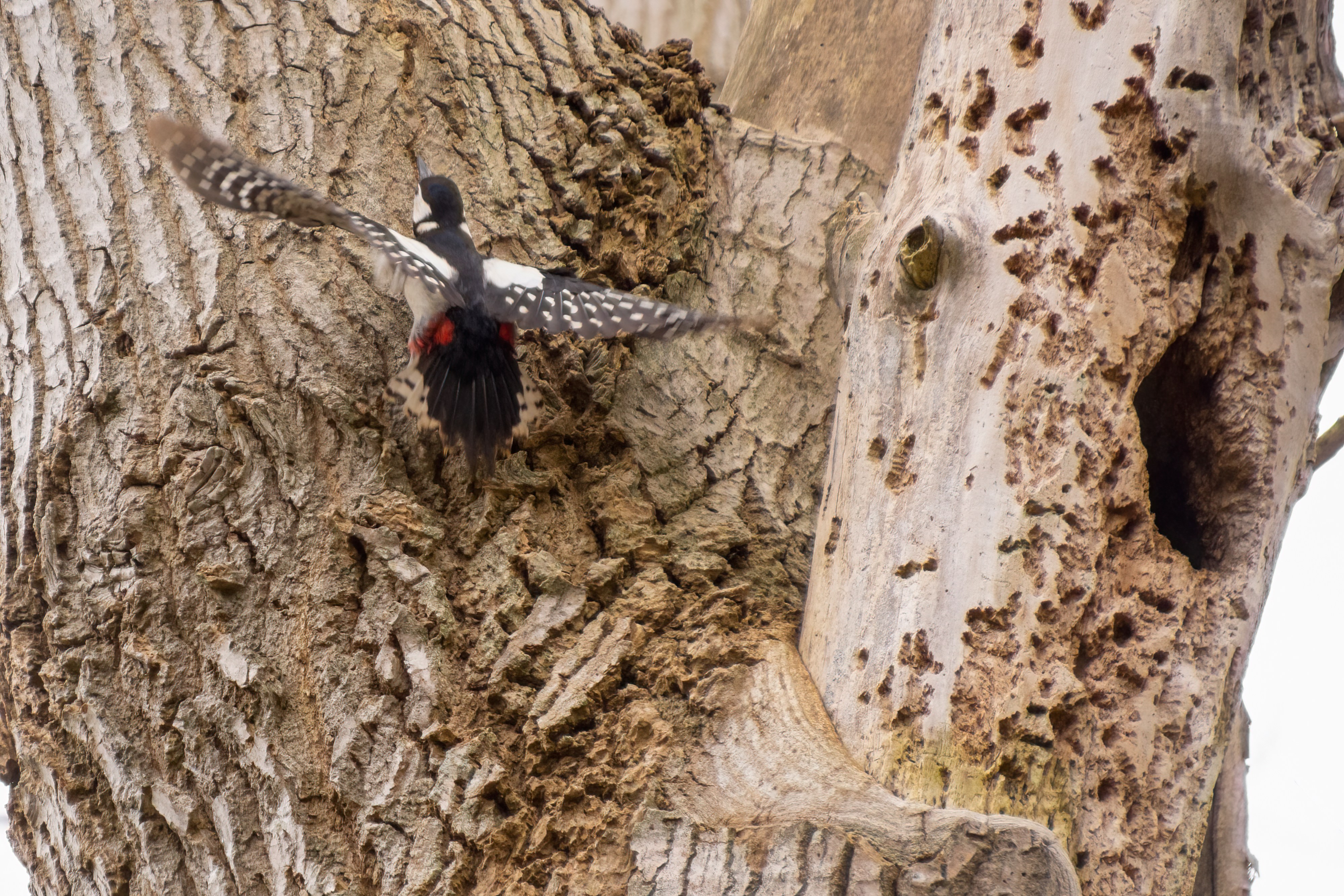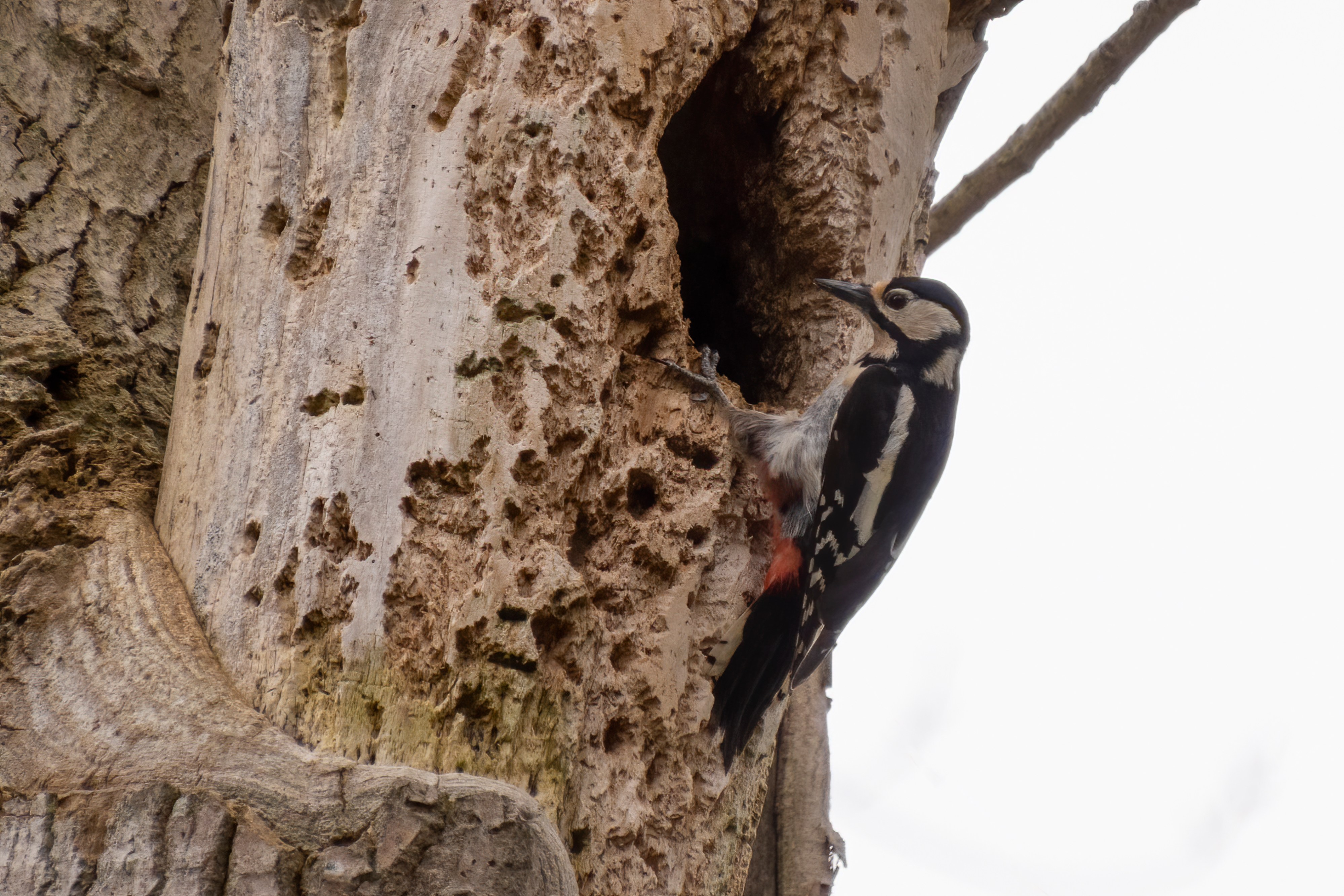 I was coming back to the beginning of the Yeovil Country Park Riverside Walk with the dogs this morning when I heard a loud tweeting sound near the old dead tree that the Woodpeckers have nested in in the past. Ooh I thought, maybe it’s a young one, and sure enough, there was a Woodpecker at the hole, looking like it was about to feed its young…