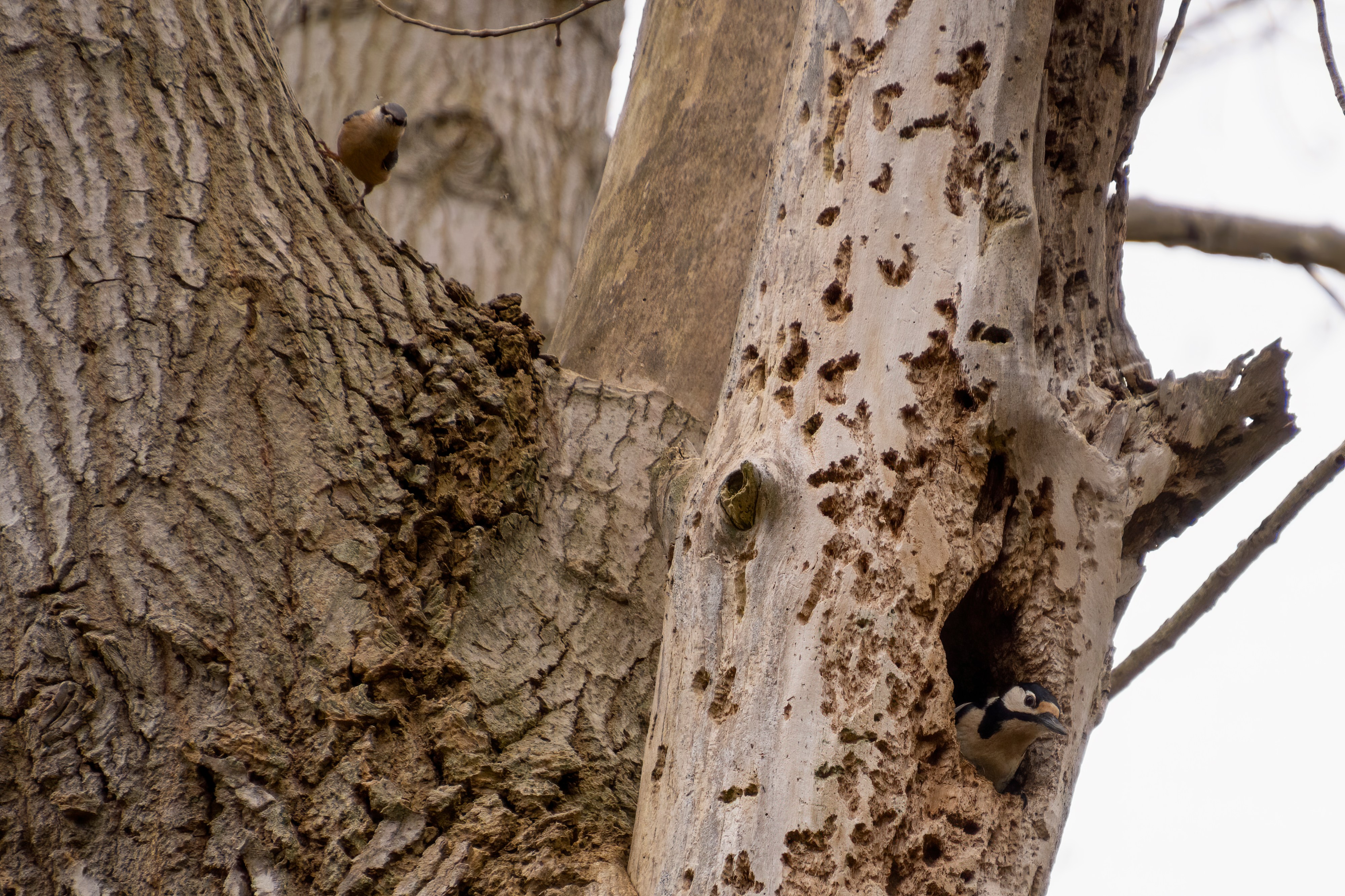Ah, I thought, maybe all is not as it seems. It rather looked like the Nuthatches had taken over the nesting hole, and the Woodpecker was raiding it, as sadly they often do. The Nuthatches were certainly trying their hardest to get it away from the hole…